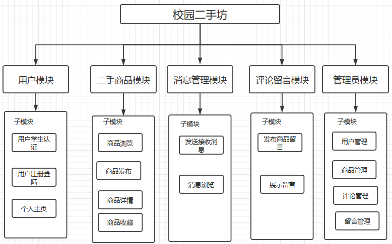 综合以上分析归纳,本校园二手交易平台应该实现基本的用户模块、二手商品模块、评论留言模块、消息管理模块、个人主页模块以及管理员模块。